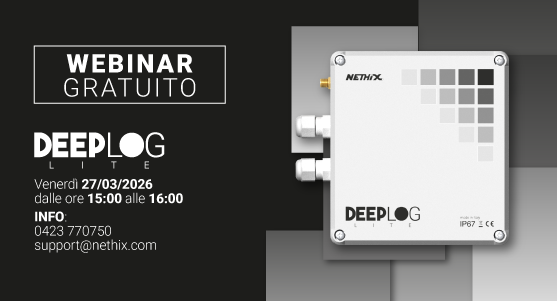Nethix's free webinars returns! We invite you to join our next webinar, focused on DeepLog LITE, the new Nethix device for data collection and sending in remote environments. Battery-powered and rated IP67, DeepLog LITE is the ideal solution for applications in unattended plants. The meeting will take place Friday 27 March 2026 from 3.00 pm to 4.00 pm The following topics will be covered: - Product introduction: technical specifications and features - Device configuration via online wizard and app - Data transmission methods At the end of the session, there will be time for questions from participants. Don't miss this opportunity: click the button to register and take part!