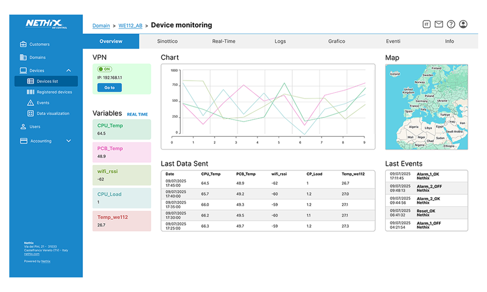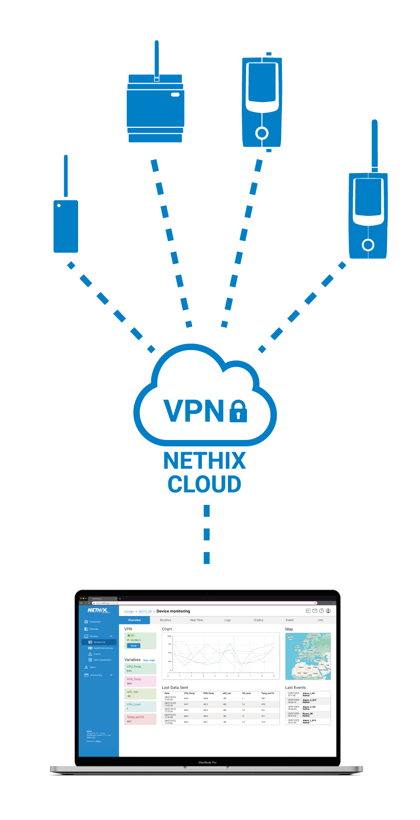 The Cloud service, offered by Nethix, provides the remote control and monitoring in real-time of unattended sites. Through GPRS, UMTS and LTE connections, Nethix Cloud collects data and information from all devices deployed on the field and make them available on a central monitoring station in an intuitive and complete visualization.