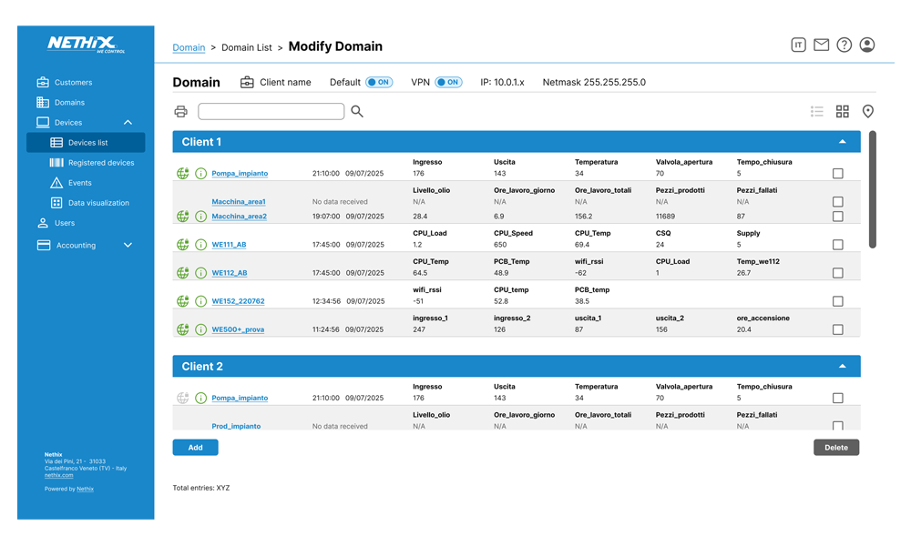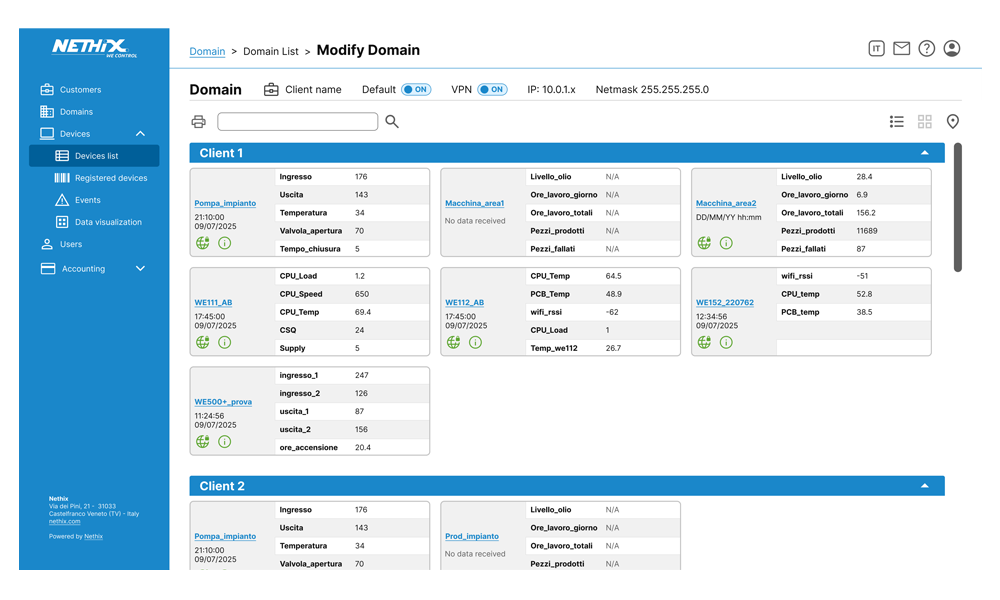 Nethix Cloud offers a VPN service, that allows to establish a private and secure connection between the devices and the users. It's thus possible to read the data in real time and change the device configuration, connecting directly to the integrated Web Interface. All devices included in the same VPN Network can also communicate with each other, establishing remote automation logics.