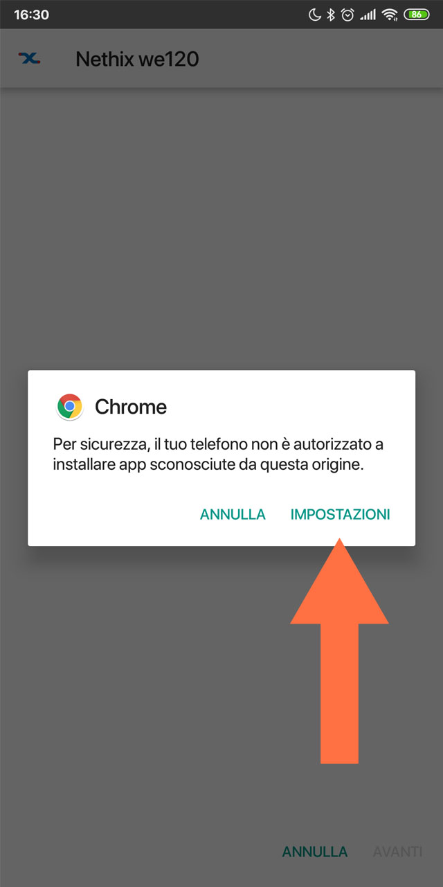 Ora il telefono ci avverte che per motivi di sicurezza non è autorizzato ad installare app sconosciute.