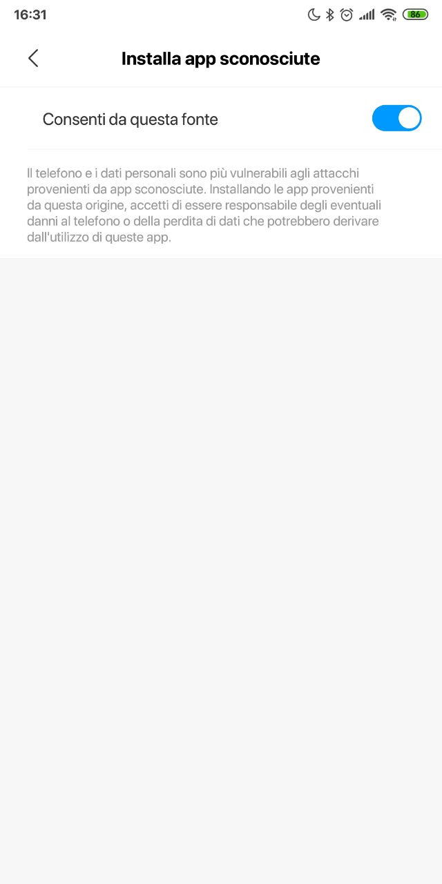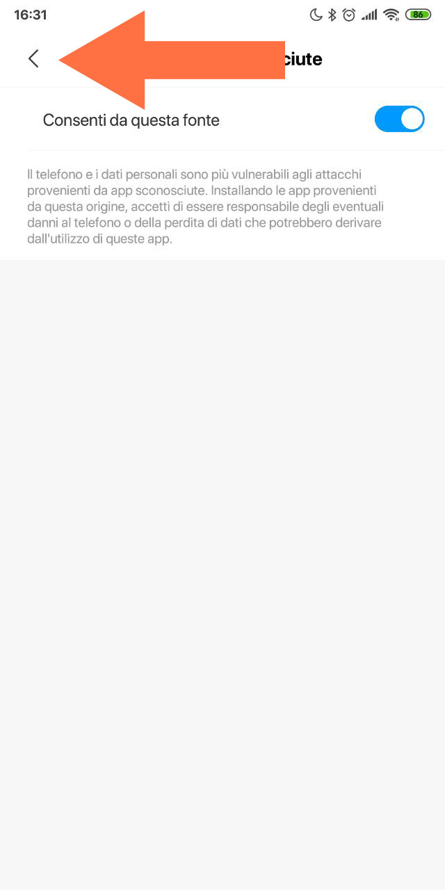 Toccando impostazioni si accede a un'altra schermata dove è necessario attivare l'opzione Consenti da questa fonte.